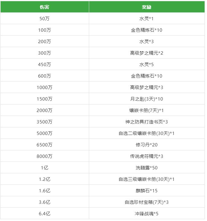 个人伤害奖励当个人对世界首领伤害达到一定值时,可以在游戏里领取奖励,输出越高,奖励越丰富!对世界首领造成的所有伤害都会计入累计值。