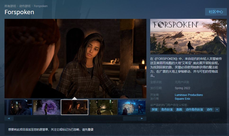 SE夜光制作组开发的动作RPG《魔咒之地(Forspoken)》现已上架Steam,计划于2022年春季发售,支持简体中文。