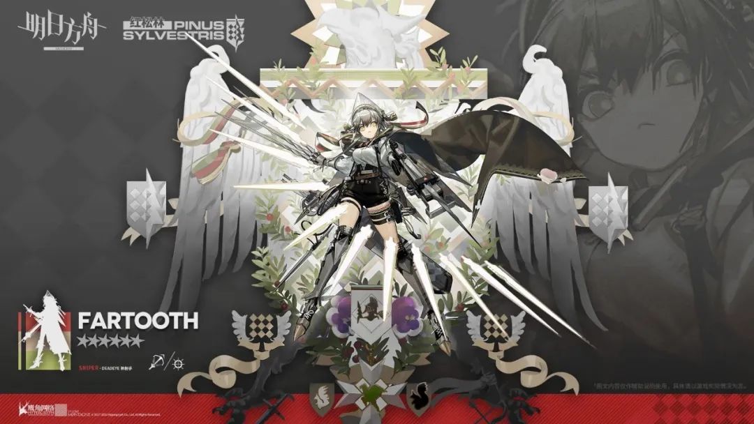 六星狙击干员,远牙。在她的精二立绘背后,我们能够发现她的原型形象:一只昂首的巨大白鹰,下垂着双翼。但是有一个怪异的地方,这只鹰不同于常规干员的背后灵,它的身上不具备任何配色。