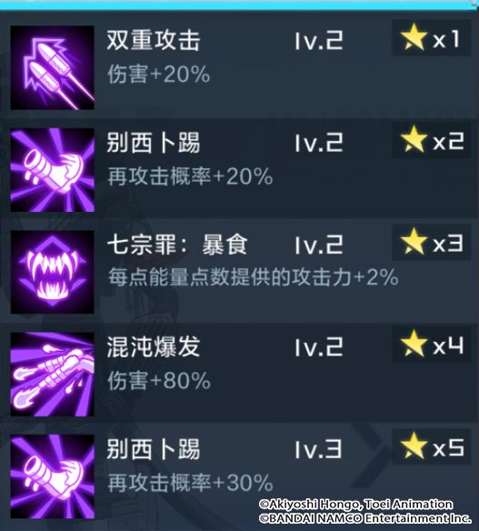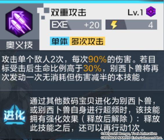 技能解析:双重攻击是别西卜兽的主要爆发技能,攻击单体敌人2次,共可造成180%的伤害;如果敌人生命比例高于30%,还将再次造成2次45%的伤害。每回合高达4次的攻击次数,让别西卜兽的得意技更容易触发。同时进化效果可以额外行动一次,让别西卜兽的输出变得更加强力。另外,奥义技的低AP消耗,也让技能流转变的更加流畅。