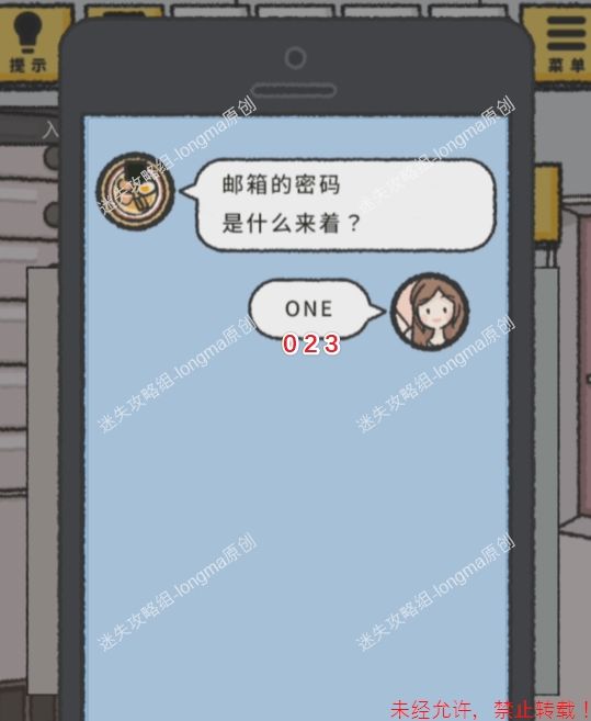 40.点击手机,查看聊天,得到密码:023。(换个角度看字母,O=0,N=2,E=3)40