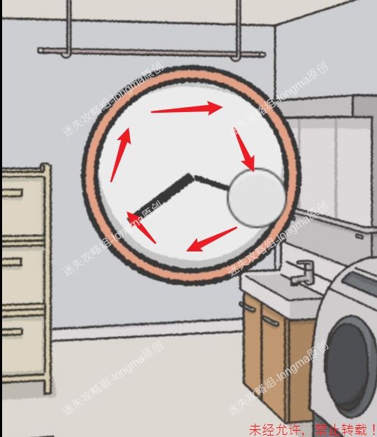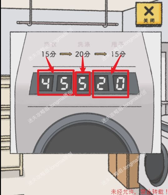 26.回到脱衣室,点击洗衣机,将洗衣机上标注需要多少时间和现在时间对照,计算出密码:45520(计算方法:洗衣需要15分钟加上现在时间的分针时间30分钟,洗衣需要定时到45,从45分开始,洗涤需要20分钟,洗涤结束后分针指向5,甩干需要15分钟,结束后分针到达20)。26