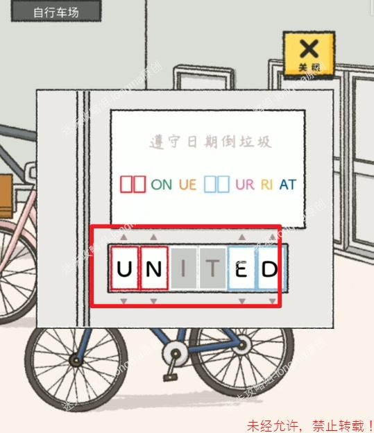 21.来到自行车场,点击右侧大门,查看门上的字母颜色,和垃圾袋上相同颜色的字母进行配合,得到红色框内填UN,蓝色框内填ED。21