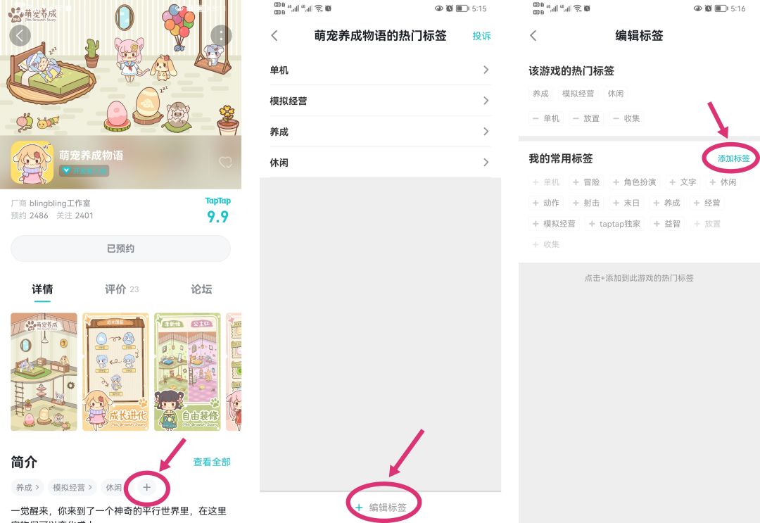 添加下您觉得想在游戏中体验到的玩法,或者风格、特点等标签(可参考下图由左到右进行操作),比如“单机”、“收集”、“治愈”、“剧情”、“休闲”等都可以,