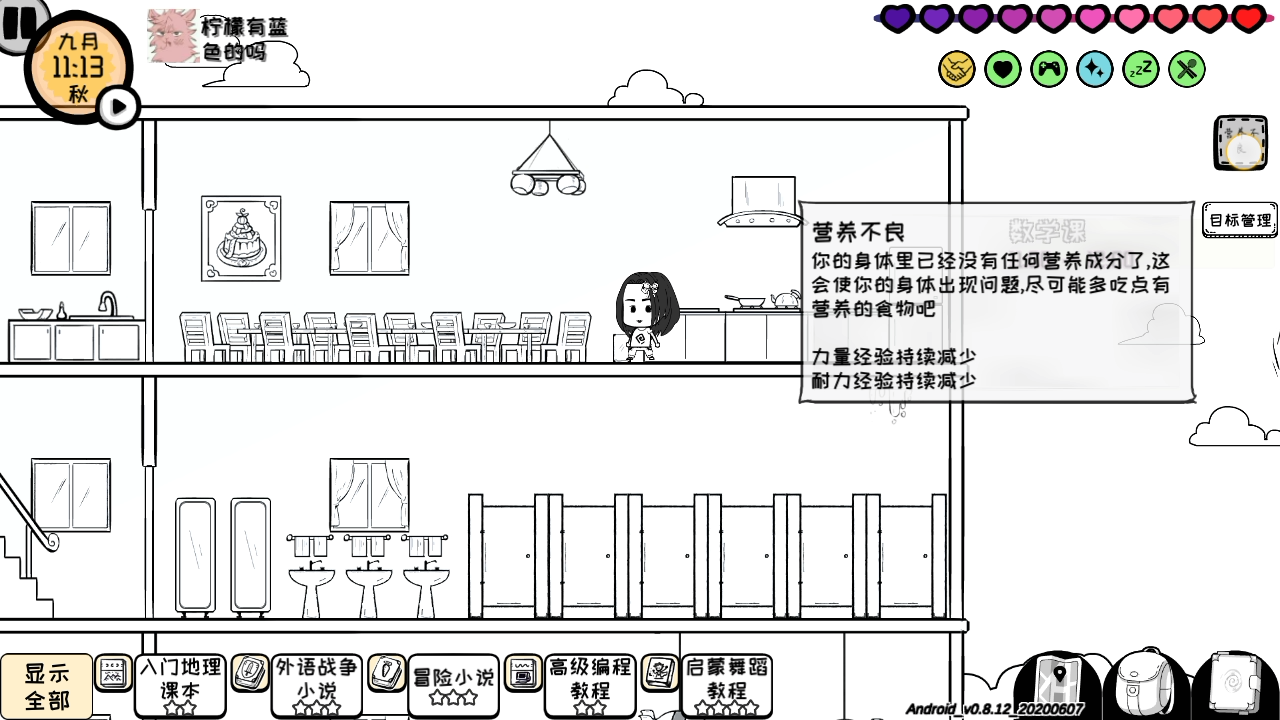 我大概试了一下,如果刚出现营养不良就很快改善这种状况的话,就不会扣很多数值,但如果持续营养不良状态到一个小时或更多,你的力量和耐力值就会飞速下降。所以就会出现你只是带着这个状态睡了一觉,然后就发现自己的力量值归零了的状况