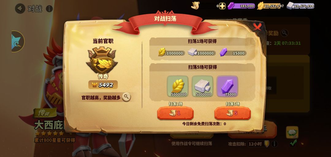 每天可进行50次对战,拥有5次免费扫荡机会
