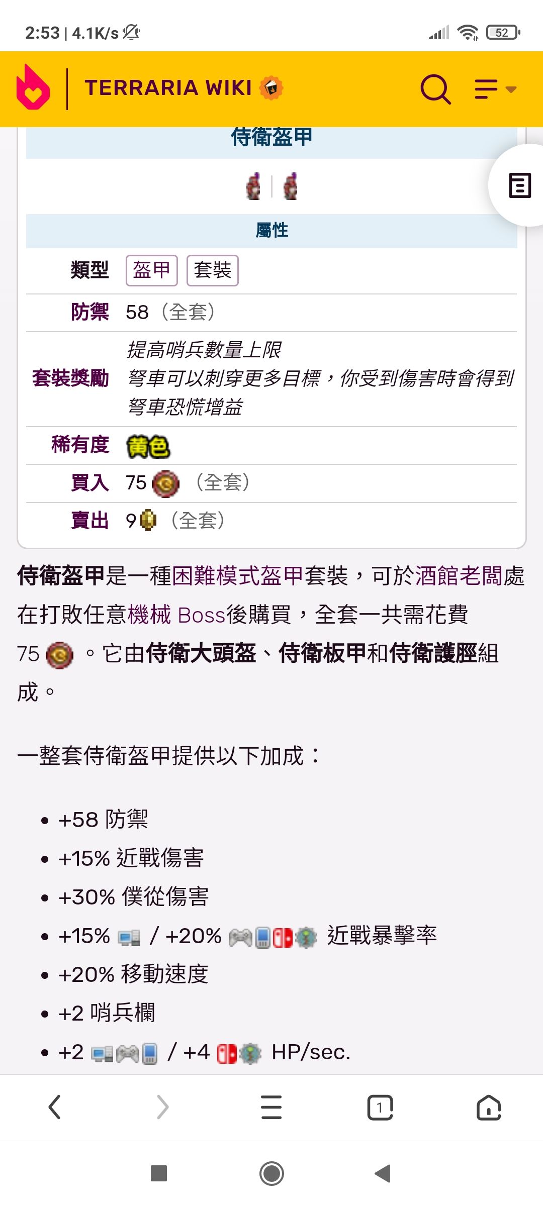 英灵殿骑士套装,石巨人之后的套装,wiki的属性中回血加成是1.41版本的,目前是8回血。同样拥有20%的近战暴击,防御能力方面堪比甲虫套,配合闪亮石、心灯、篝火、蜂蜜和再生戒指等,可以在不动的时候打到一秒60的回血能力,效果异常逆天,配饰搭配合理的话基本可以无视攻击在250以下的伤害,召唤伤害加成为60,仅次于星尘套。