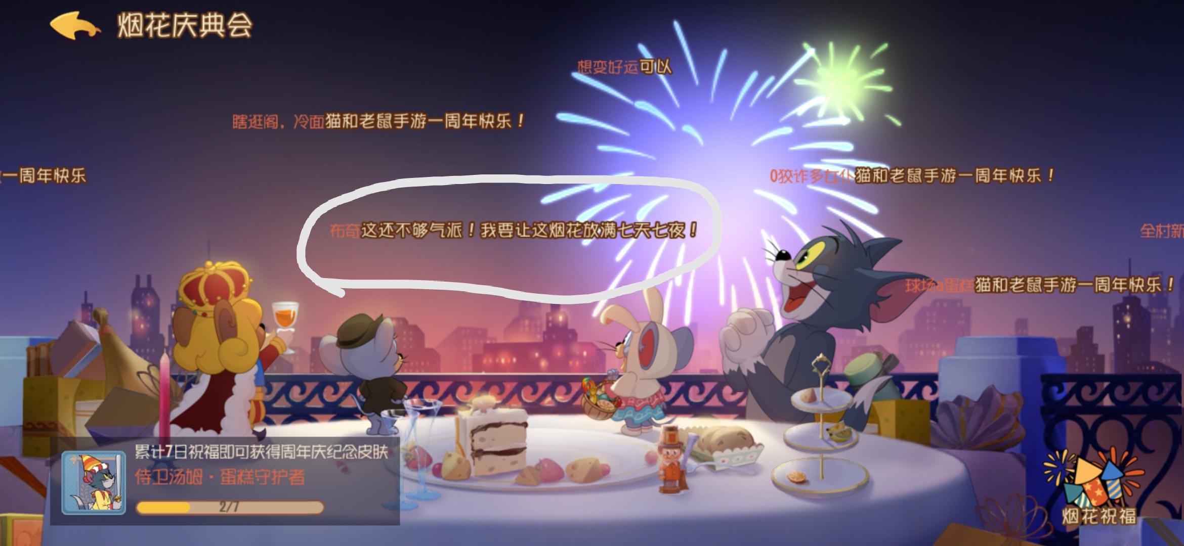 整点的时候烟花庆典会出现猫鼠角色发的祝福弹幕。刷到这个弹幕就能领奖励了。