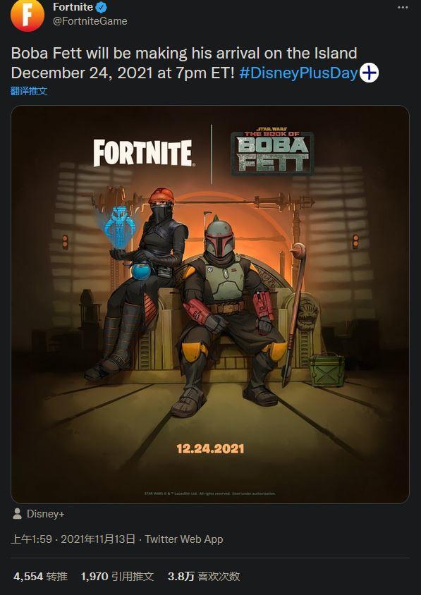 《堡垒之夜》官方推特今天发文宣布,《星球大战》经典角色,赏金猎人波巴·费特(Boba Fett)将会于今年 12 月 24 日作为新皮肤加入《堡垒之夜》。