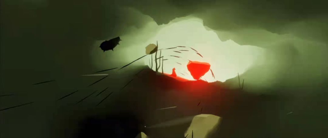 强劲的风卷着黑色的石头在空中乱撞,小鸟也在强风的影响下难以控制自己的身体,艰难的在空中飞行着。