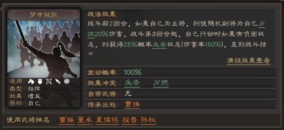 传承自三皇之一“曹操”,属于指挥增益效果,具体的效果是——“战斗前2回合,如果自己为主将,则使随机副将为自己分担20%伤害,战斗第3回合起,自己行动时如果有负面状态,则获得25%概率反击状态(伤害率150%),直到战斗结!”