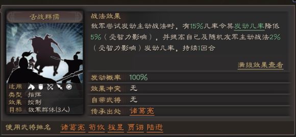 传承自诸葛亮的战法,属于指挥控制型战法,具体的效果是:“敌军尝试发动主动战法时,有15%几率令其发动几率降低5%(受智力影响),并提高自己及随机友军主动战法2%(受智力影响)发动几率,持续1回合”