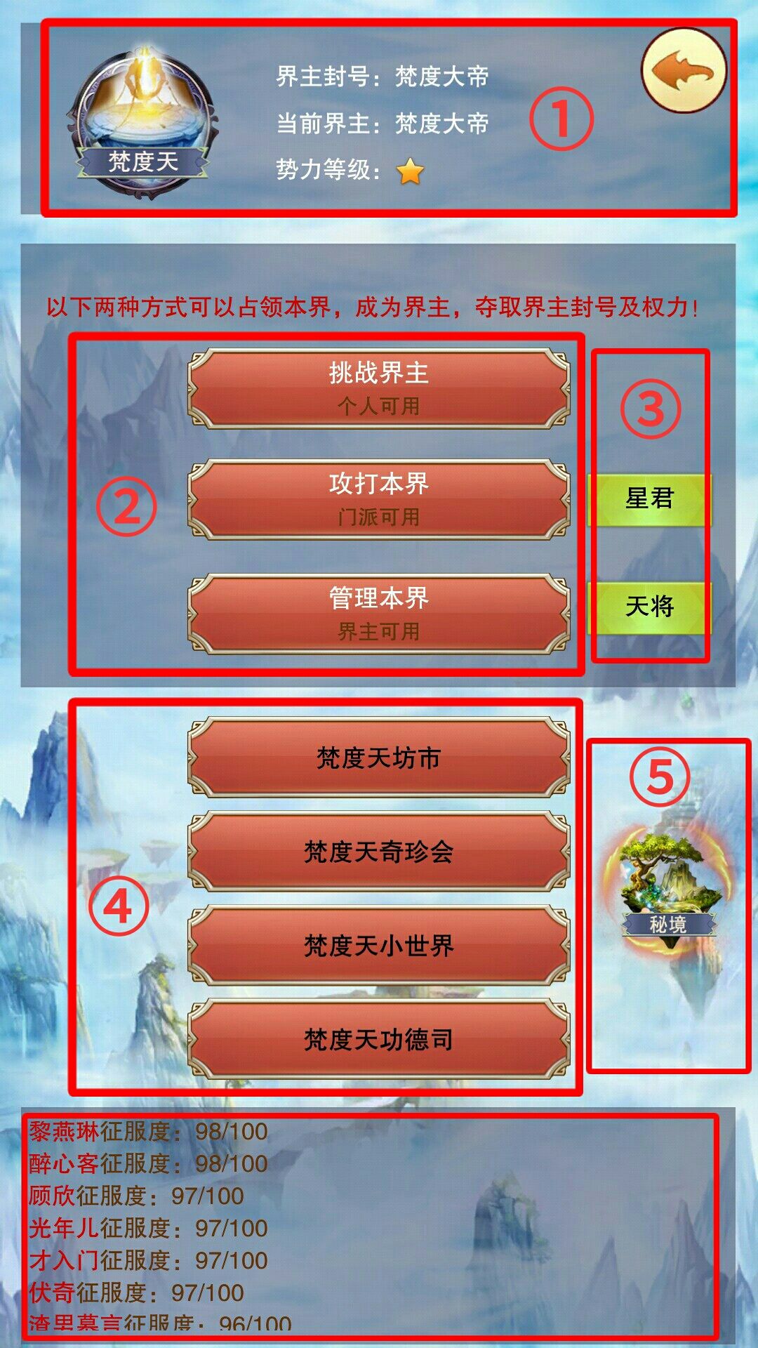 挑战界主:每天可挑战1次,胜利后获得征服度。(征服度在最下方显示)