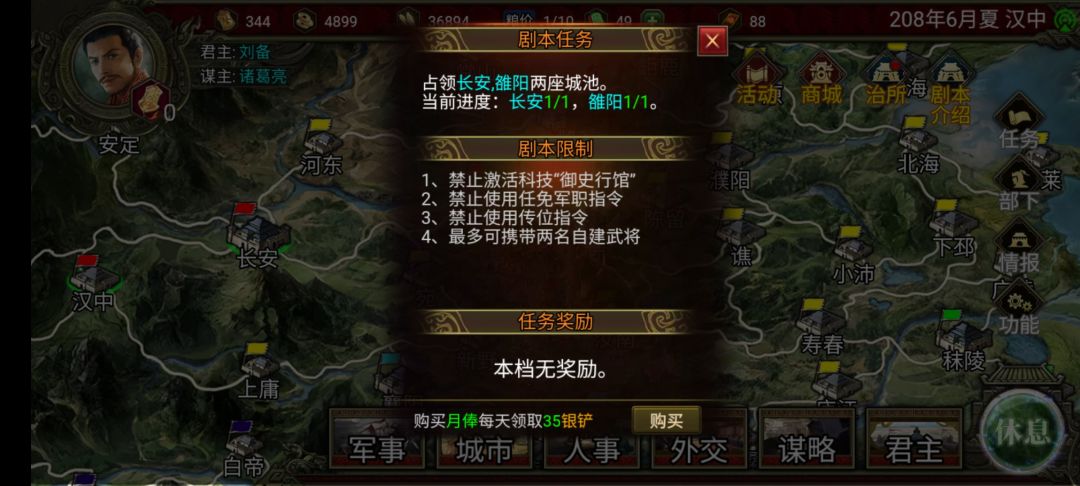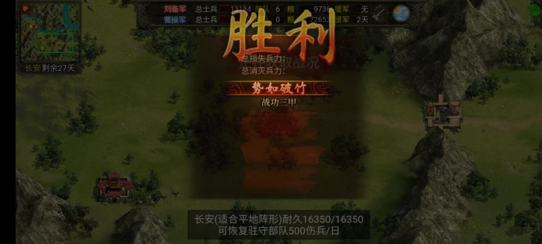 通关思路:偷家。利用电脑部队攻城的当月,电脑兵力远离长安雒阳,我方部队攻击长安雒阳时,电脑需派援军最快五天才能到达现场,我方则利用五天时间占领全部城池即可攻下长安雒阳。这里的话一种是可以一个月就攻下两个城,利用带强行的武将二次攻击,也是五天之内占城;另外一种就是分两次,一次占一个,只不过分两次这种我没试过,但是理论上是一样可行的,所以本次我主要说一月下两城。