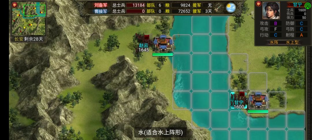 进攻长安,果不其然,就算城里有兵也不出。这里赵云锥形阵用疾行直奔最上方的城池,甘宁带疾行先去河边,然后用会布阵的武将给甘宁换上水阵,其他几个城随便派人去占就行。