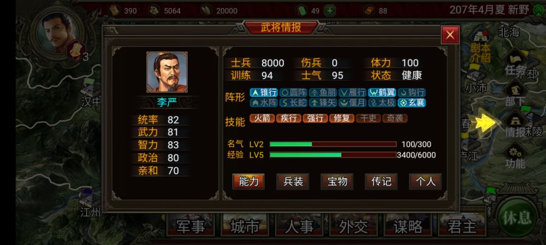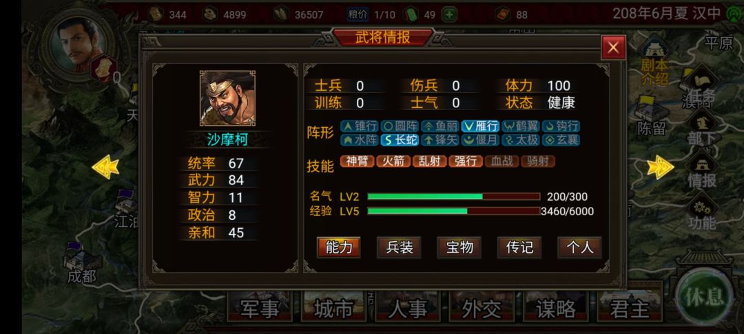 既然通关思路已经想好了,那么我们就先来收集条件:有【强行】的武将,经过我多次尝试发现只有两个人合适,李严和沙摩柯(能开出经验自己培养的当我没说),李严开局就在刘表那里,沙摩柯则是碰运气,看他被那个君主录用且没有提升忠诚度也好录用过来,不过几率太小,所以我们不讨论沙摩柯,我这个档也没有录到沙摩柯,他被登用时我去看了一下直接98忠心,我放弃了,而且读档还不一定会被电脑登用。