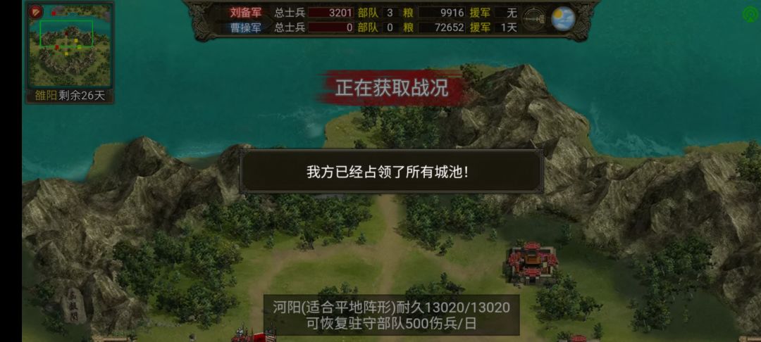 重点说一下雒阳,最少只需要两个带强行的武将,一个开局水阵去河对岸,另外一个直接锥形阵开疾行一天一城,