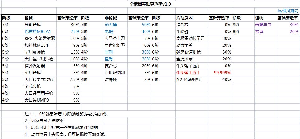 常用全武器及8阶怪穿透率一览