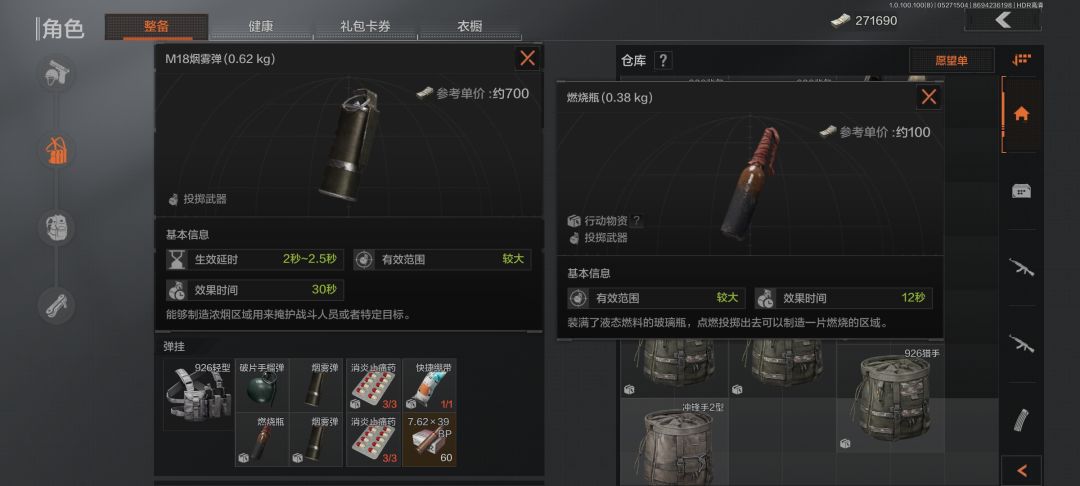 如果你还有预算,可以选配一些战术投掷物。比如手榴弹可以帮助你清理死角埋伏的敌人,烟雾弹则可以在掷出后遮蔽敌人视线,震撼弹可以限制敌人行动等等。暗区中投掷物种类很丰富,大家可以自行探索,或者看一下老皮给大家写的投掷物使用攻略。合理运用投掷物往往能为你带来巨大的交战优势。