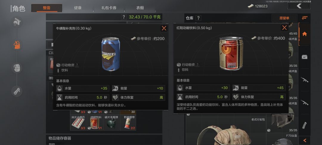 最后,如果准备长时间作战,最好再携带一些食物和饮料。在暗区中,你的能量和水分会随着时间降低。此外当战斗中腹部被击中损坏时,能量和水分也会快速消耗。缺水会持续性地减少健康值,而饥饿不仅会减少你的健康值还会影响角色的体力。当然在暗区中经常能在各处捡到食物,所以农场这样的小地图倒是没必要特地携带,但你最好还是带上两瓶饮料,因为使用药物会大幅降低角色的水量。目前暗区里很受欢迎的饮料是牛磺酸补充剂和红阳功能饮料,因为他们可以同时补充水分和能量,并且还能恢复先锋的体力,延长跑步和架枪的时间。