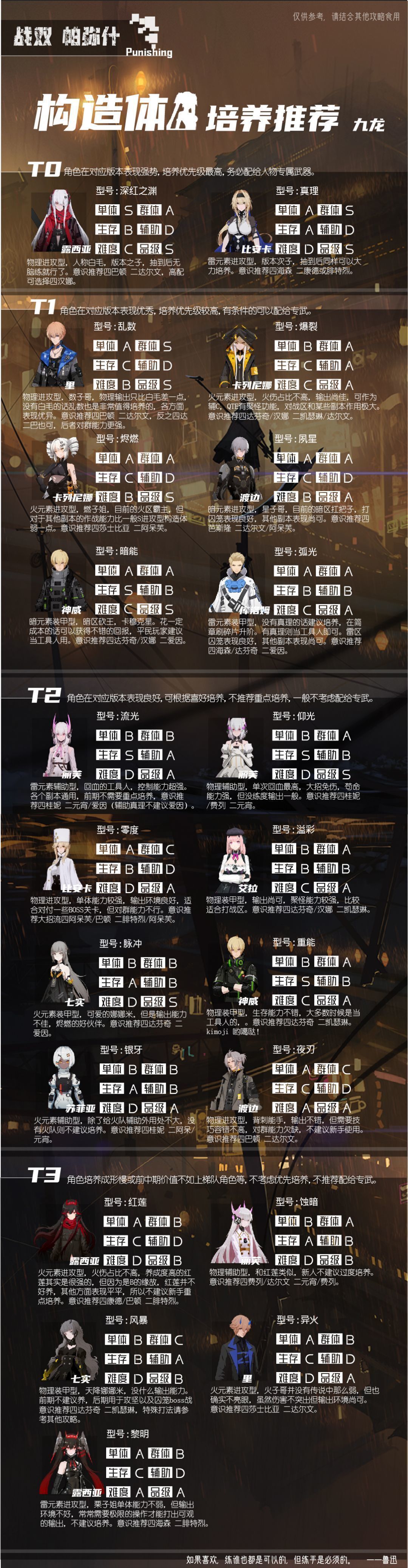 这个问题论坛众说纷纭,但是在我看来其实战双这款游戏现在对于特定的构造体需求不算太高,其实并没有人权卡这一说,而且官方也在某次直播中说了会尽量让所有玩家拿到所有构造体,也就是说你可以根据自己的喜好练自己喜欢的构造体,总而言之就是可以谁帅就练谁,但是总归还是会有差异,所以我放张图在这,可以自行抉择,另外呢战双在游戏的中后期,也就是开启了战区和囚笼以及一系列主线剧情外的关卡后,对于构造体数量的需求会大增,这个问题我后面再详细介绍