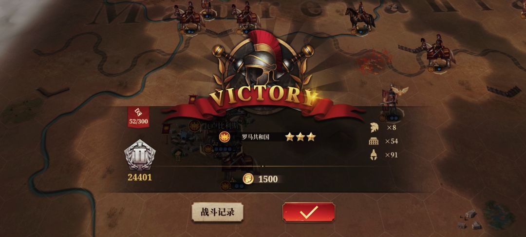 共计任命将领8名、先后反复争夺、防御性占领、完全占领54座城池、剩下91支军团,用时51回合。