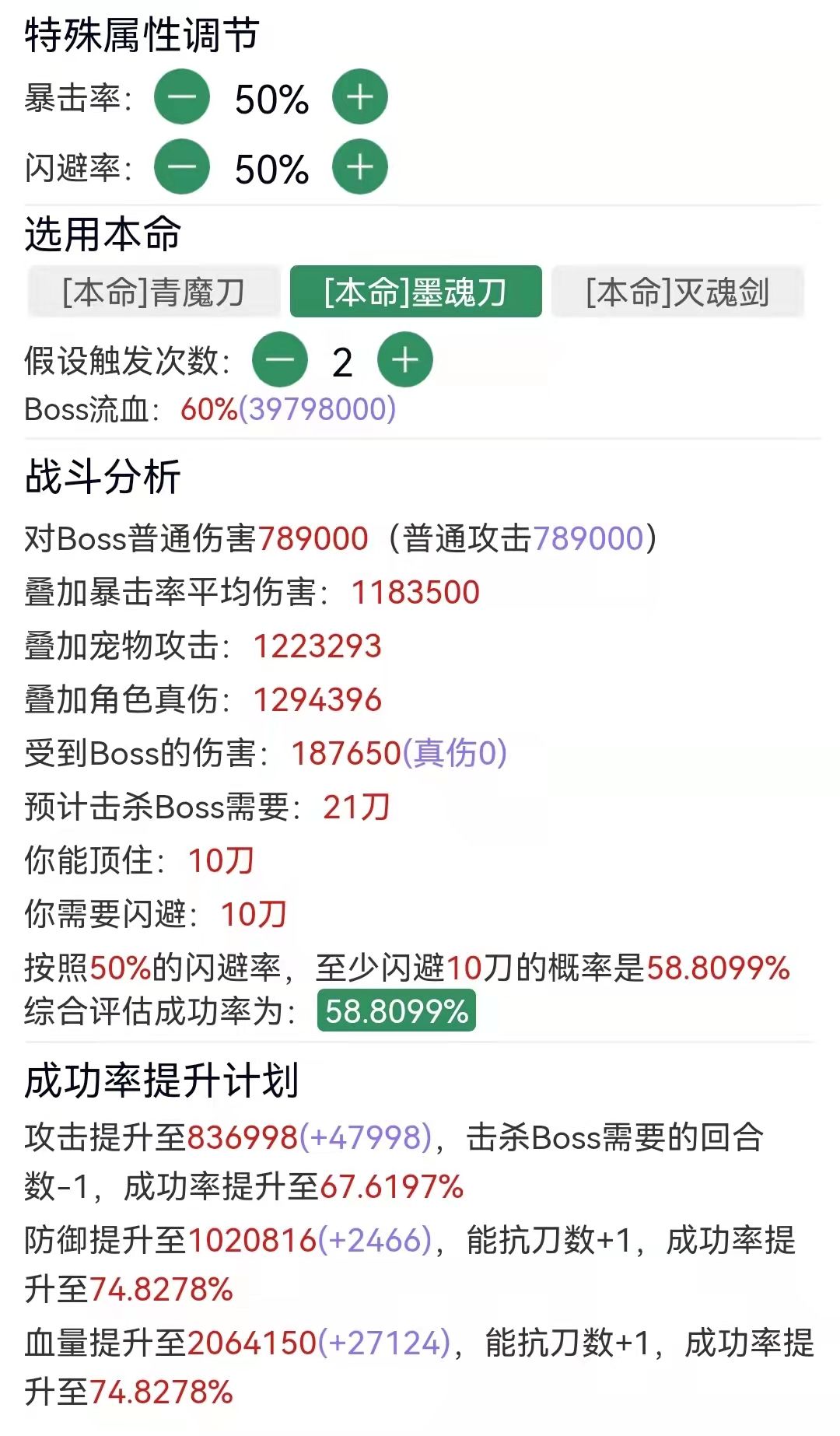 举个例子,按照我目前的属性79万攻击,101万防御,望仙楼90层抗10刀,不触发墨魂击杀boss需要53刀。如果用墨魂刀,触发两刀的情况,成功率有59%。是不是很吸引人?是不是很想拿起墨魂刀去干了他?我也是这样想的,然后我真的拿起了我的两星墨魂去干了200轮,结果啥都没发生。