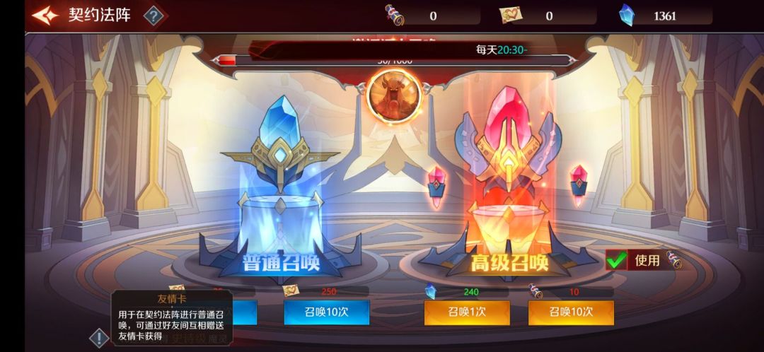 高级召唤是使用砖石【一般都是靠砖石抽卡的多】或者召唤卡,砖石一次是240砖石,十连就会打九折,召唤卡呢主要是通过各种各样的活动任务获取,详情看图