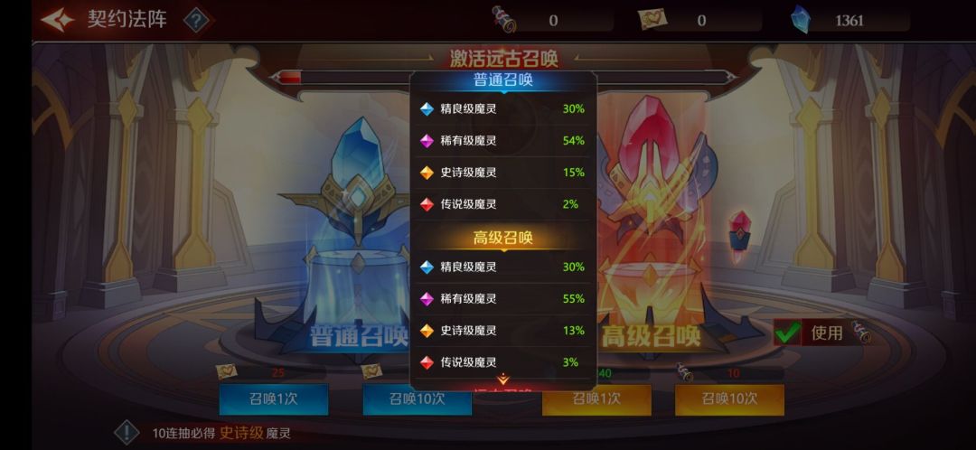 契约法阵分为普通召唤,高级召唤,远古召唤
