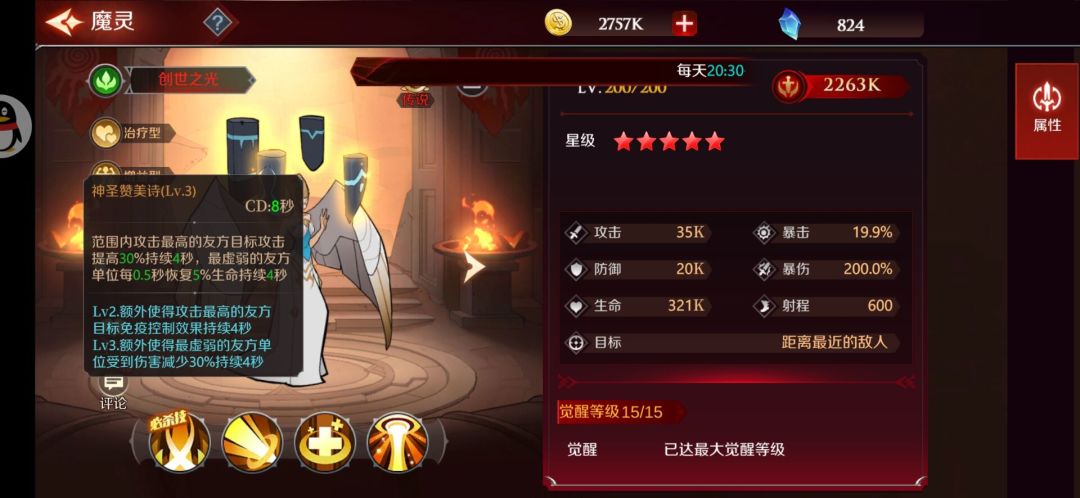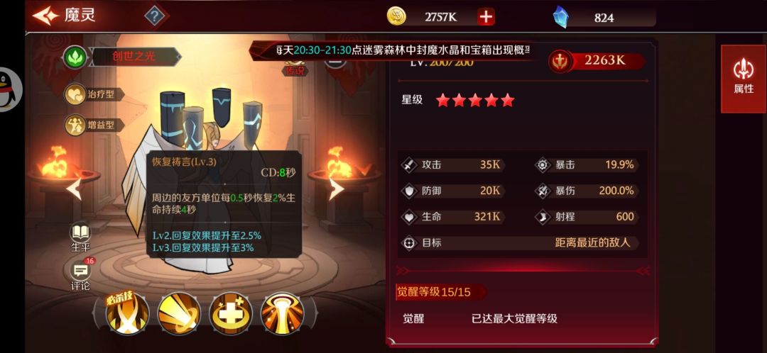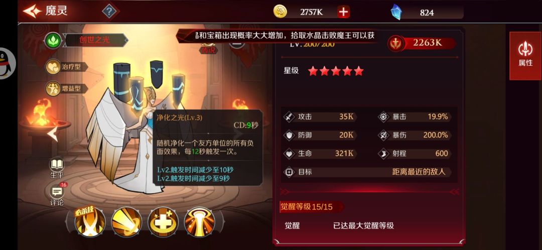 创世之光了一个治疗兼辅助的辅助净化奶,大招给身边的最高攻击的友方加30%的攻击4秒,还能最虚弱的友回血25%左右,每12秒还能净化友方一个队友的负面状态,也是挺好的一个卡。主堆生命防御,治疗也是百分比