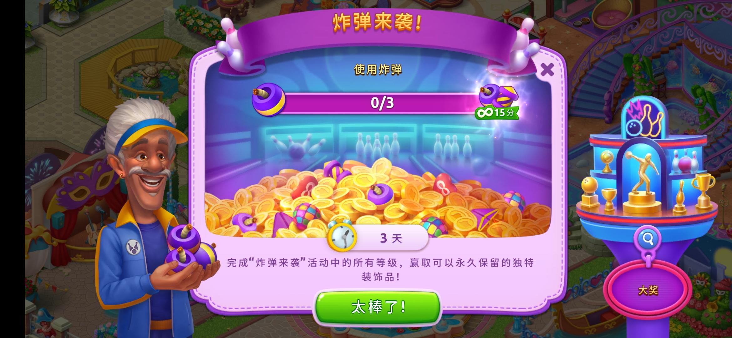 新活动-炸弹来袭,闯关卡,得道具,完成阶段目标获得最终装饰物奖励。