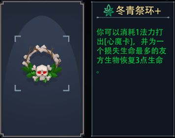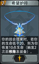 升级后:你的回合开始时,若你的生命低于20,则抽2张牌,为你恢复10点生命并移除本装备。
