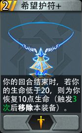 升级后:你的回合结束时,若你的生命低于20,则为你恢复10点生命(触发3次后移除本装备);