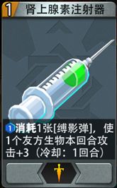 肾上腺素注射器:消耗1张[缚影弹],使1个友方生物本回合攻击+3(冷却:1回合)。