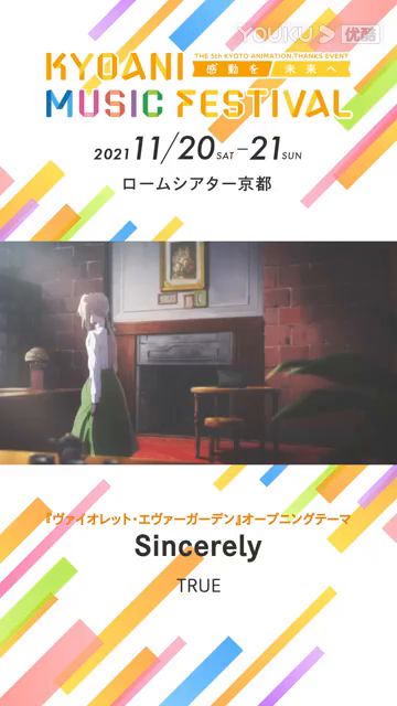 老牌动画厂京都动画(京阿尼)于11月15日今天公布最新活动宣传片,主题来自旗下经典动画系列《紫罗兰永恒花园》,最新活动为京阿尼粉丝感谢大会《KYOANI MUSIC FESTIVAL》将感动推向未来》,预定2021年11月20日~11月21日线上线下同步举行,敬请期待。