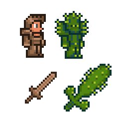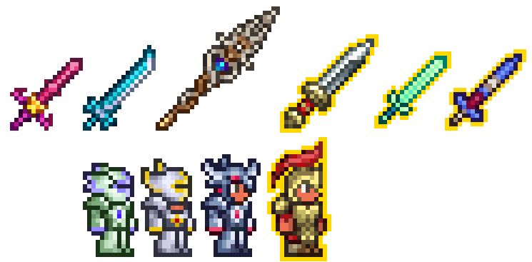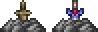 真正的剑堆贴图上剑的部分可以很明显地看到红蓝相间的附魔剑剑柄,这样的剑堆挖破后有98%的概率获得一把附魔剑,还有2%的概率获得一把更强大的变种武器:泰拉魔刃。