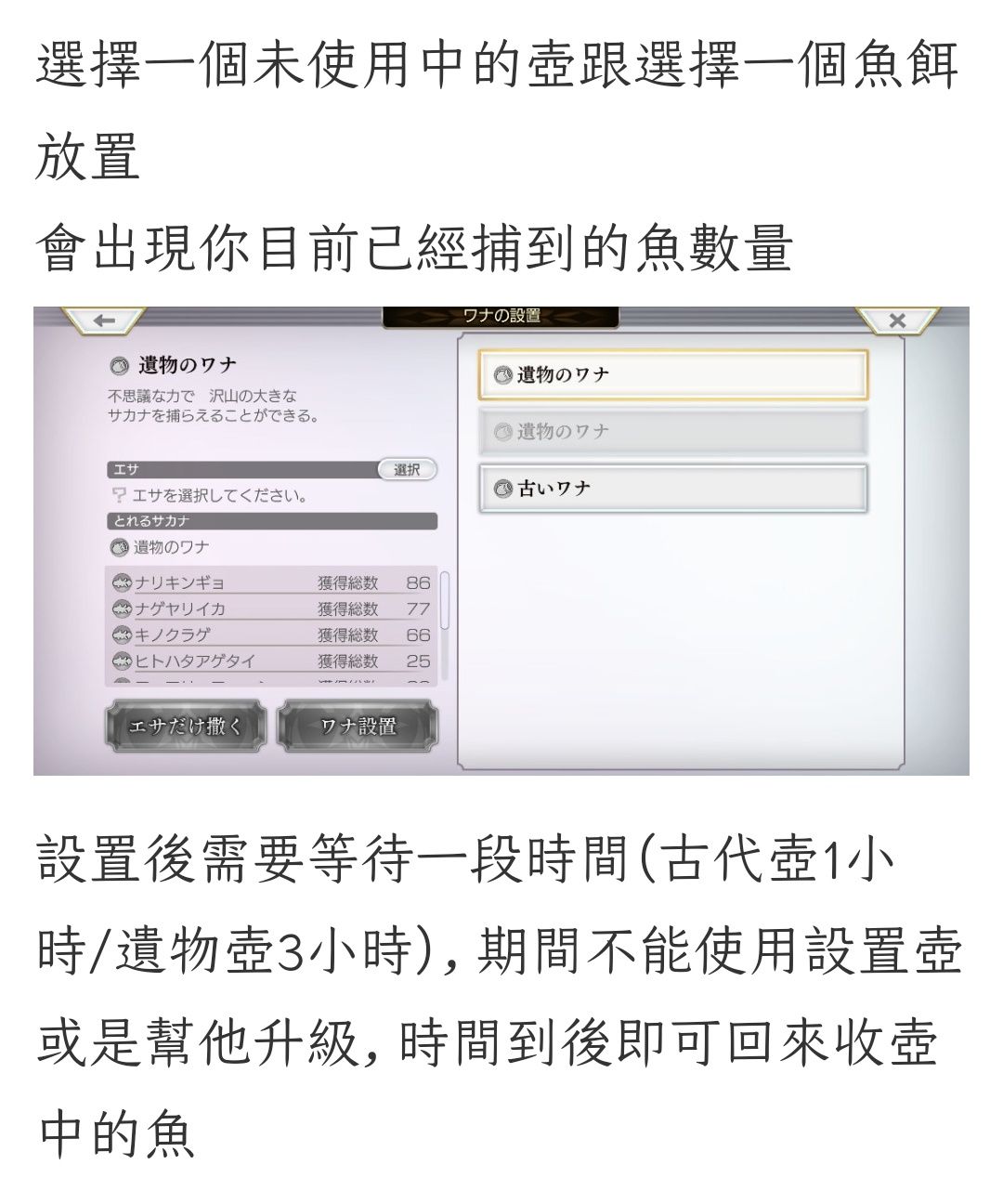 陷阱捕鱼要放置鱼饵,等1小时或3小时来收网,个人觉得这类似于老版本钓鱼里边的普通饵和强化饵。这次捕鱼还出了新的鱼石,旧鱼石可兑换新鱼石,但前提条件是钓鱼鱼箱和鱼钩都升满了。等更新后,不明白的,大家再一起研究研究。