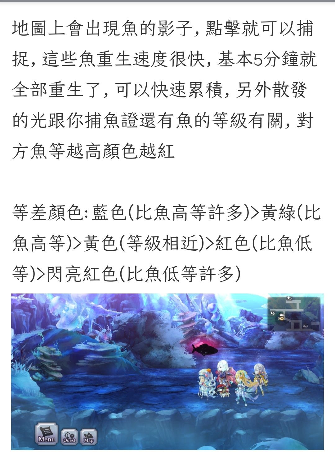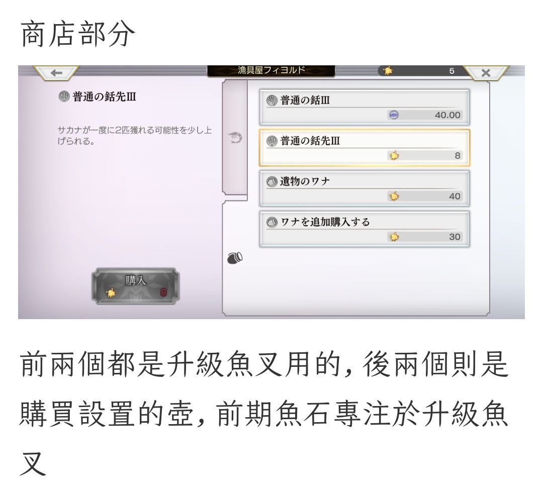 这个新的捕鱼具体我也没玩过,看这玩法说明大致是分为鱼叉捕鱼和放陷阱捕鱼。鱼叉捕鱼刷新时间快,鱼的颜色决定是否能捕捉到它,前期优先升级鱼叉。