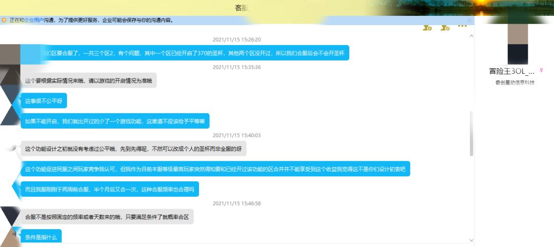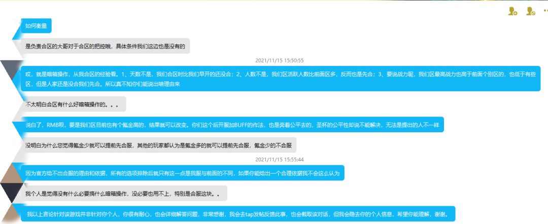 而造成这一问题的根源就是官方无序的合服!!!试问谁知道每次合服的依据是什么?日活跃用户?开服天数?战力差距?都不是,以我区为例,我服合服时,比我服人少的服未合区;比我服早开的服未合区;比我服最高战力高或者低的服还是未合区。这其实并不奇怪,因为官方客服都说不出合服依据,全凭策划🐷的一句话。但让人气愤的是这个人脑子不好,我服两周前二合,今天就三合,试问谁能理解你这脑洞。以下为与官方客服的对话(我针对的是策划🐷,对客服没什么意见,故隐去客服的个人信息)