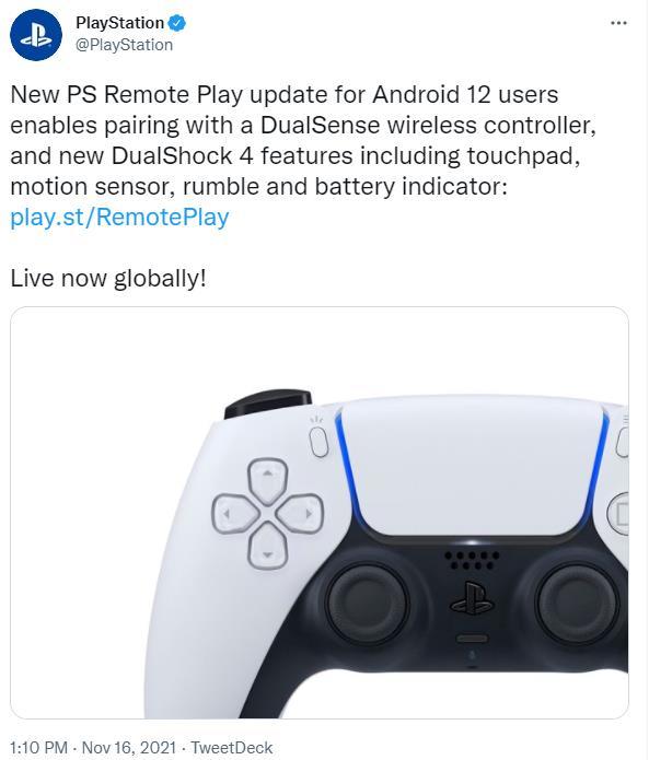 今日(11月16日),索尼官方发推宣布为安卓12用户准备的最新PS Remote Play软件更新将允许用户连接DualSense无线手柄“DualShock 4”。