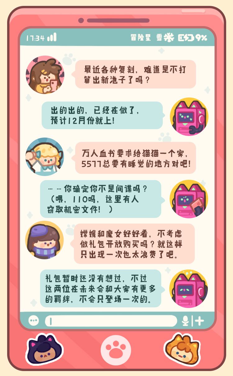 因此,许多冒险家对《猫工烧饼坊》栏目的期待值也渐渐变高,大家都想通过这个栏目知道猫工到底画……做了哪些饼。正好前一段时间又做了一波征集建议的活动,于是桃子再次请来了猫工来回答大家的一些疑问,请大家掌声欢迎!