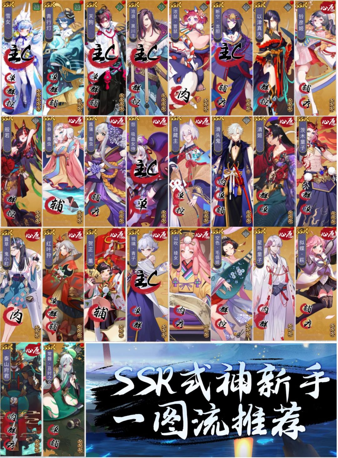 新手期根据前期抽到的SSR 主要培养几个主C式神, 根据主C去搭配羁绊以提升战力。