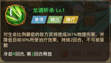 武将小结:单排流武将,攻击对面输出最高的武将并附带不可驱散的治疗,比较适合针对对面的 强攻一波流。