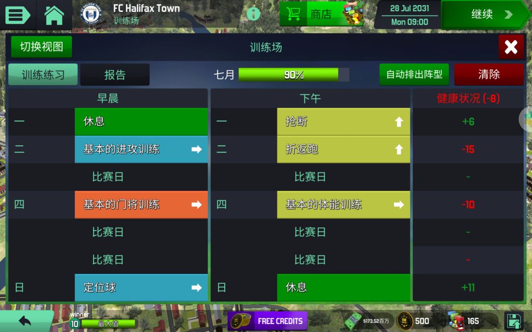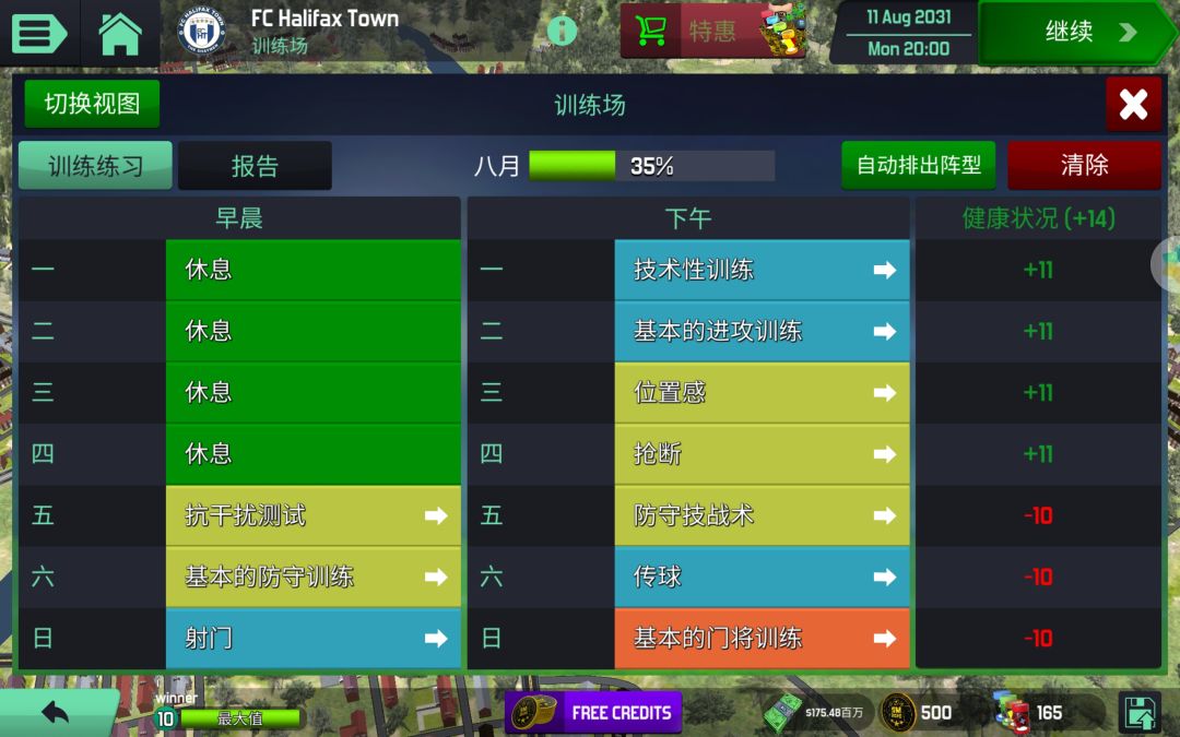 拿到未来世界级球星了,下一步就是好好训练,建议每周安排训练的时候基本的进攻训练,基本的防守训练,基本的体能训练和基本的门将训练各安排一个,防止这个周没有训练的科目发生实力下滑,比方说下面的例子(放图的时候告诉你们,现在说太远啦),第二注意比赛前一天要安排休息一天,保证有足够的体力打比赛,第三,如果在赛季中发现一整个周都没有比赛,一定要把周日调成休息,因为有80%的概率下周一打比赛,最简单的解决方法就是把每周周日下午安排休息就好了,这样尽管下周一有比赛体力可能不满,但状态也足够打比赛了。第四,注意安排的训练都有可能让球员伤病,强度越高越可能伤病,魔鬼高强度训练可能会让主力球员伤病缺席比赛,当然高强度训练也是提升评级最快的方法之一,另一种方法是租借让别的队帮你养球员练球员,还要注意训练会消耗体力,别体力消耗太多休息一天回不起来红体力条打比赛就行了。