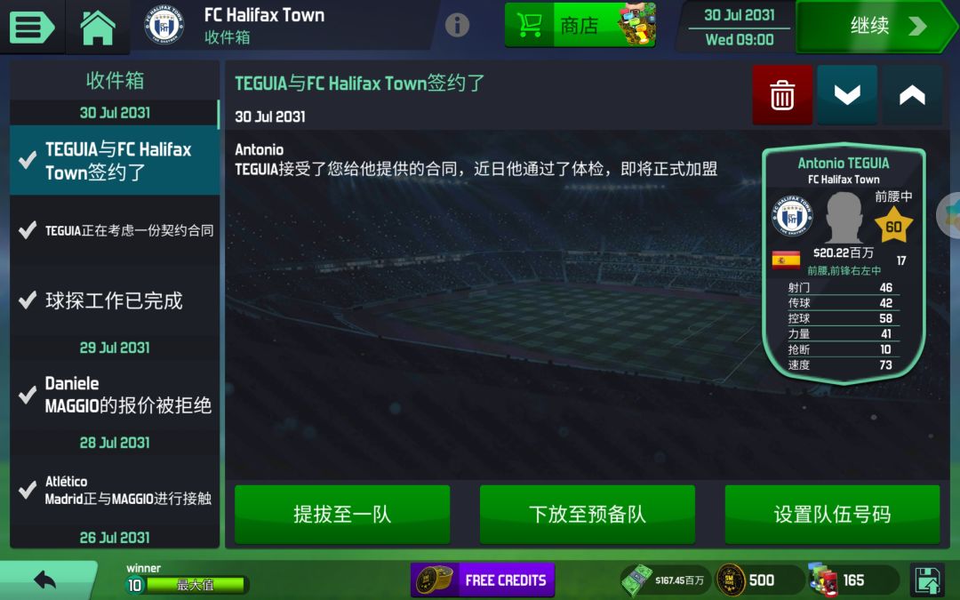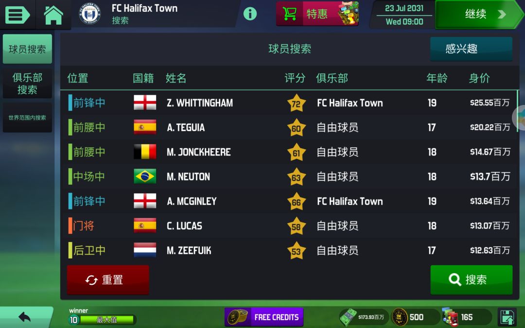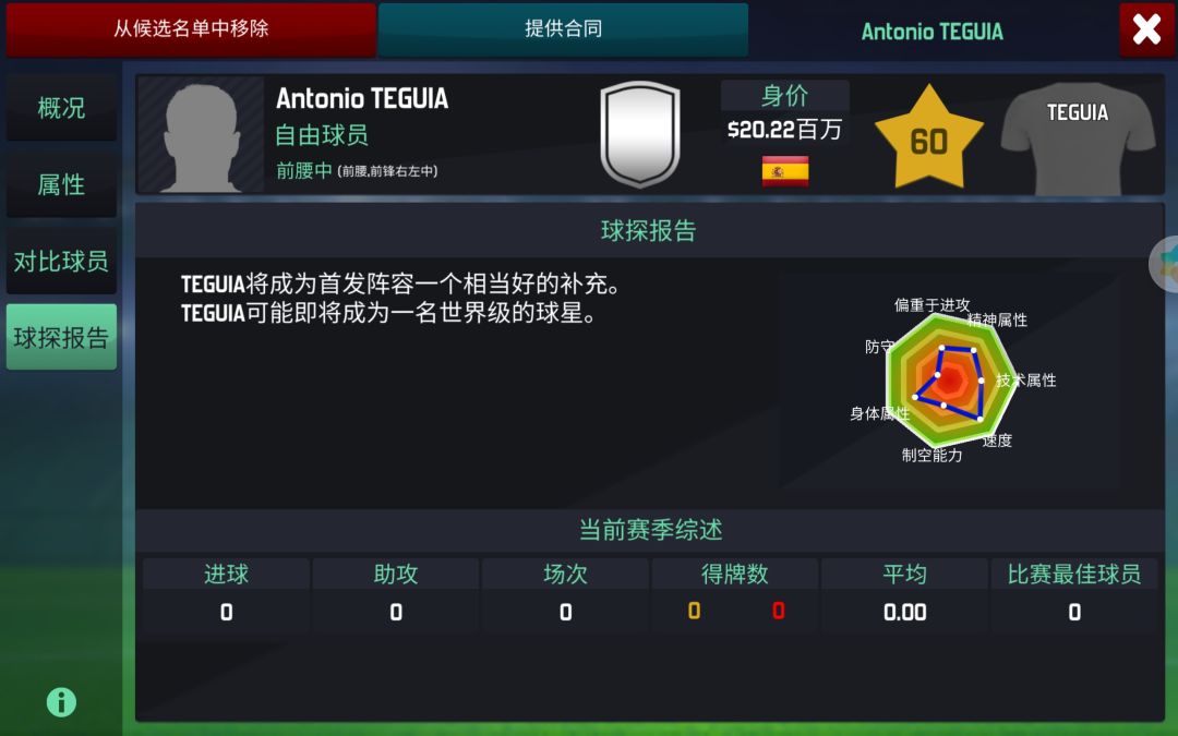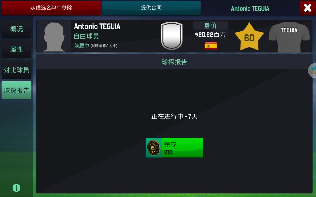 当然有时候也会拿不准主意,到底是年轻一点身价低点评级低点的好,还是年纪大点身价高点评级高点的球员好(年轻身价高当然最好啦),球探是个好东西~我的球探基建点起来了,比较快,正常球探要探15天,然后签他!