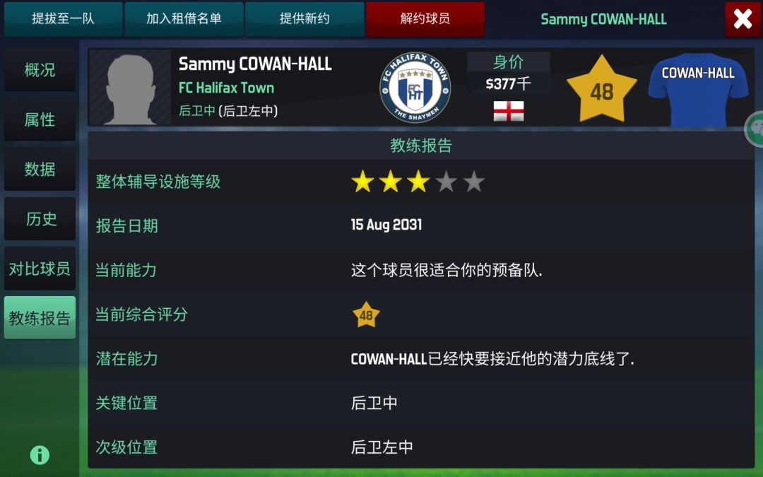 小伙伴想要培养出世界级球员,首先要知道的是每个球员都有一定的潜力,每隔一段时间潜力是一定的,年轻球员23岁之前是实力快速增长阶段,到27岁实力会慢慢增长,27岁后实力会出现下滑,如何看球员的潜力呢?教练是个好东西。下面这个没啥潜力的就随便养养卖掉了(黑心资本家),好球员也可以找教练夸夸,30天憋一句话那种。还有!懒蛋教练!报告完了不给我发邮件!要自己数30天或者时常回去瞅瞅他报告完没有!懒蛋教练!