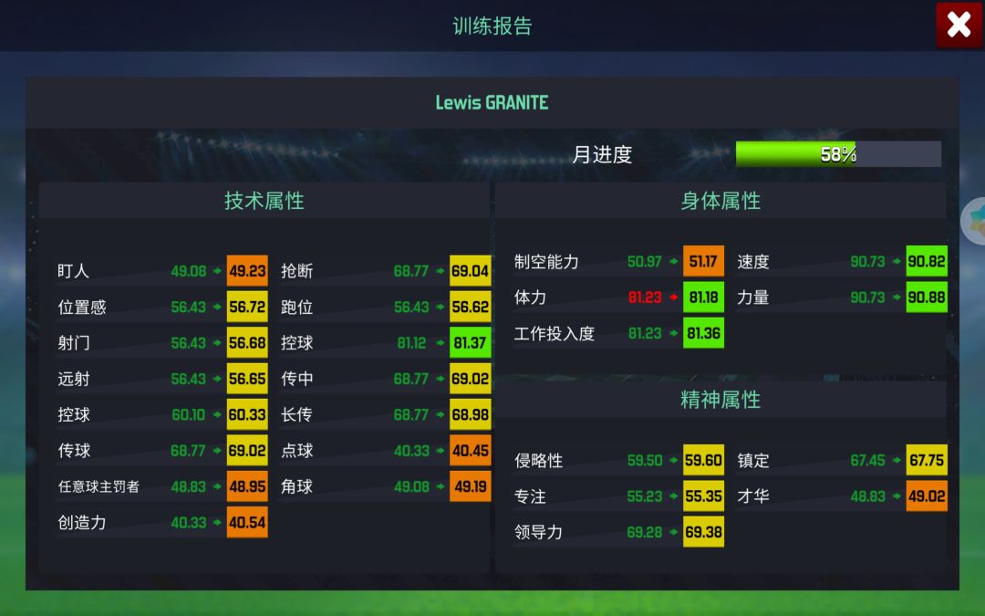 灰色的箭头表示潜力这个阶段的用光了,下个阶段又可以涨分了,下面是完全没有安排体能训练的结果(但是安排的不大好,基础的门将训练带一些体能训练的效果我给忘了)