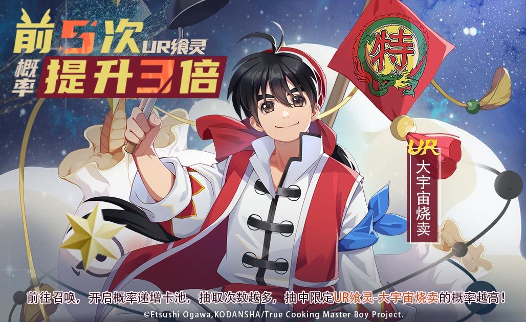 活动期间,开启概率递增卡池,UR飨灵-大宇宙烧卖限时加入卡池,御侍大人使用专属道具进行召唤,该卡池UR飨灵抽取概率大幅度提升,并且随着抽取次数的增多,UR飨灵-大宇宙烧卖的抽取概率也会随之提升。