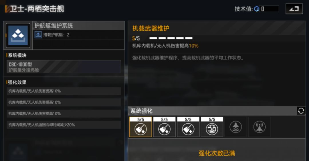 ●推荐加点:所有有关于护航艇、战机、无人机的加点,都是锁定速度优先级最高,其次是伤害和冷却,这个加点就需要根据自身护航艇的伤害来选择,伤害高选冷却,伤害低选伤害。部分会有降低载机被导弹命中率的强化,这个也是可以点的,有些飞机本身自带闪避,配上被命中率降低的强化也能起到一定的拖延时间的作用。