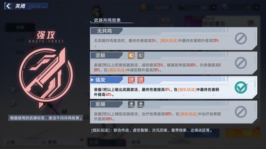 装备的这三把武器最好配合我们角色的定位来选择。如果我们的角色定位为输出,则至少装备两把输出型武器,从而激活“强攻”,提升我们攻击时的最终伤害。如果定位为坦克或辅助也是同理,激活对应的武器共鸣强化自身的能力。